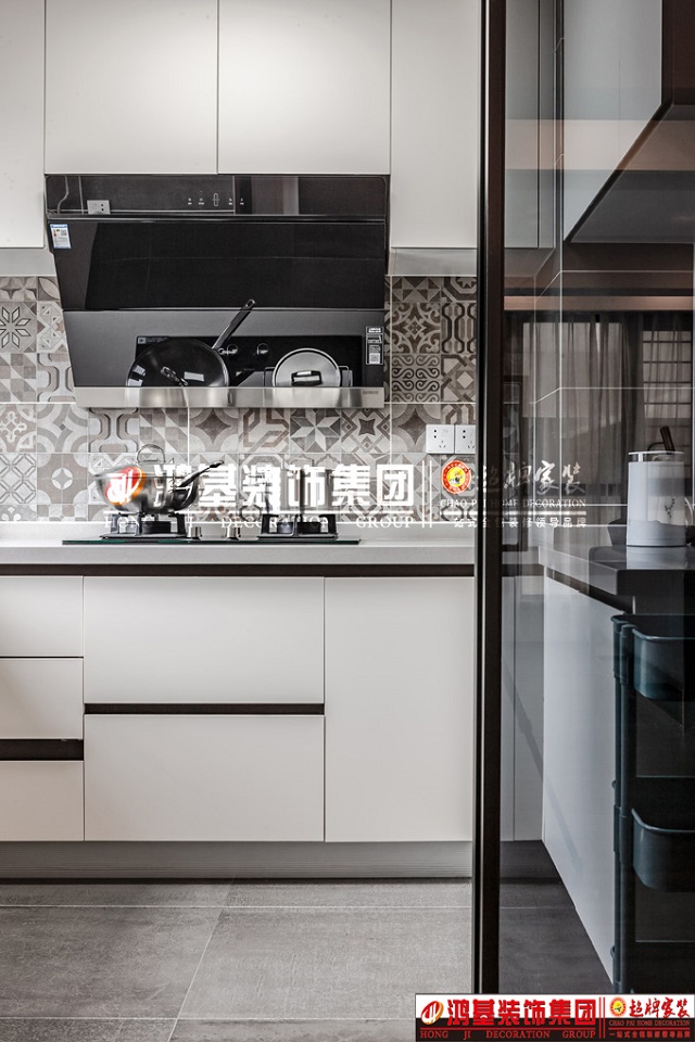 圖8.亮點(diǎn):廚房采用當(dāng)下流行的極窄推拉門(mén)透明玻璃的設(shè)計(jì),墻面采用花磚設(shè)計(jì),拒絕平庸,使整個(gè)空間充滿(mǎn)時(shí)尚感。